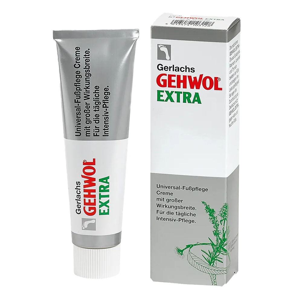 Universal foot care cream with a wide range of applications. This cream is designed for the care and protection of heavily stressed feet. It prevents burning feet, athlete's foot, foot odor, calluses and blisters, and restores dry, chapped skin to suppleness. Gehwol Extra also has a beneficial effect on cold feet, winter toes and excessive foot perspiration.